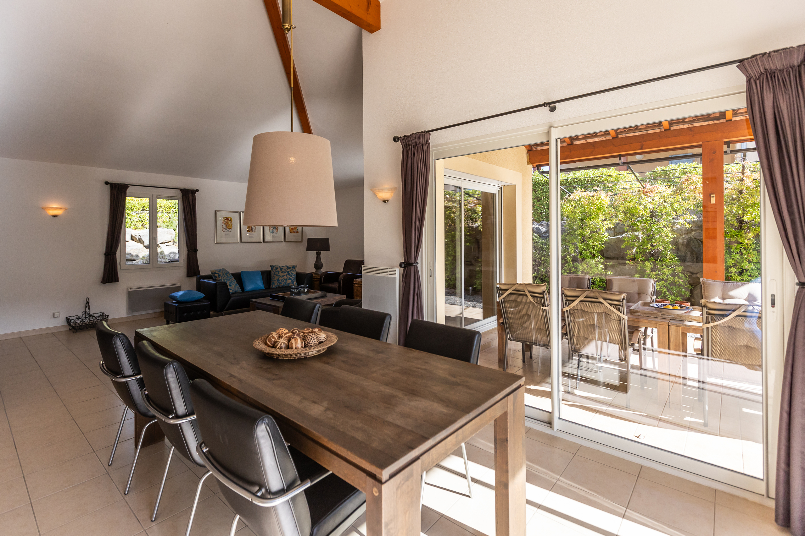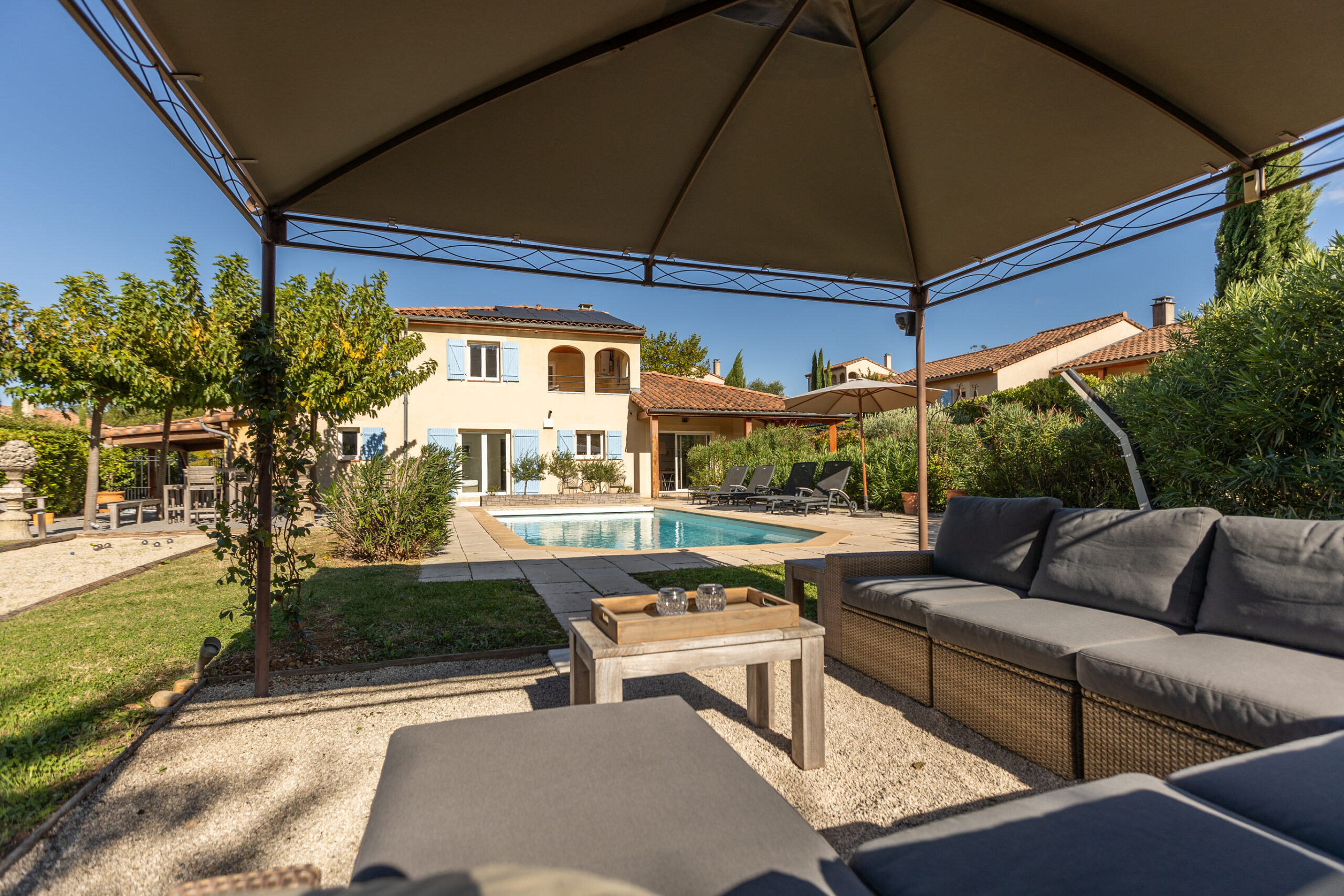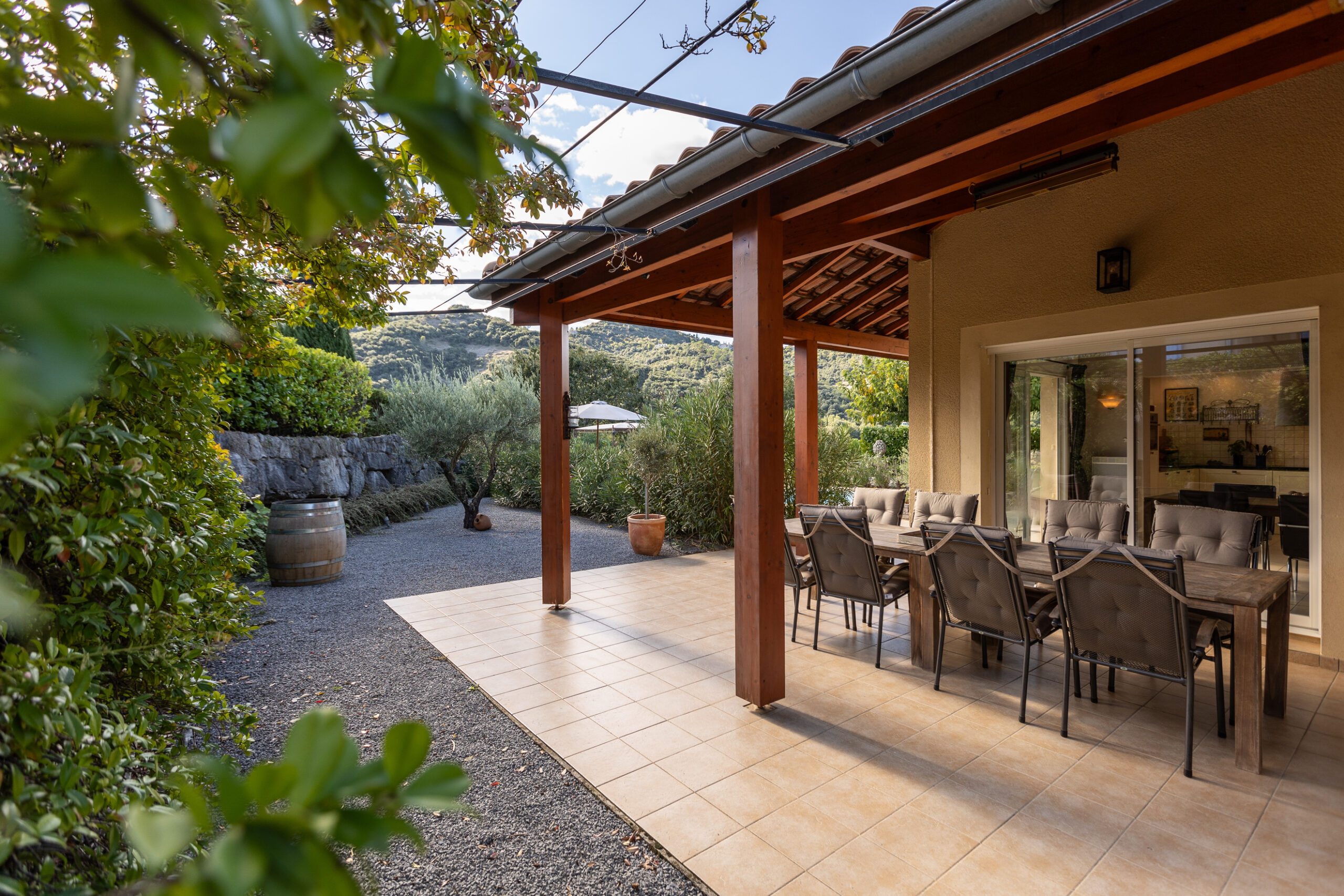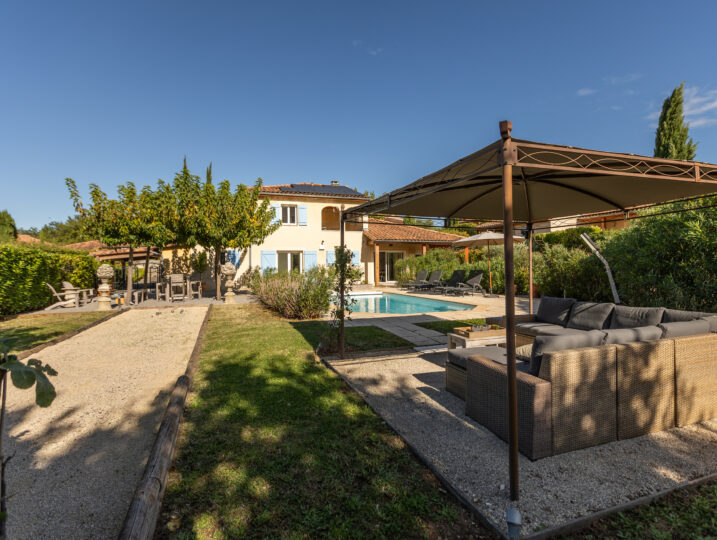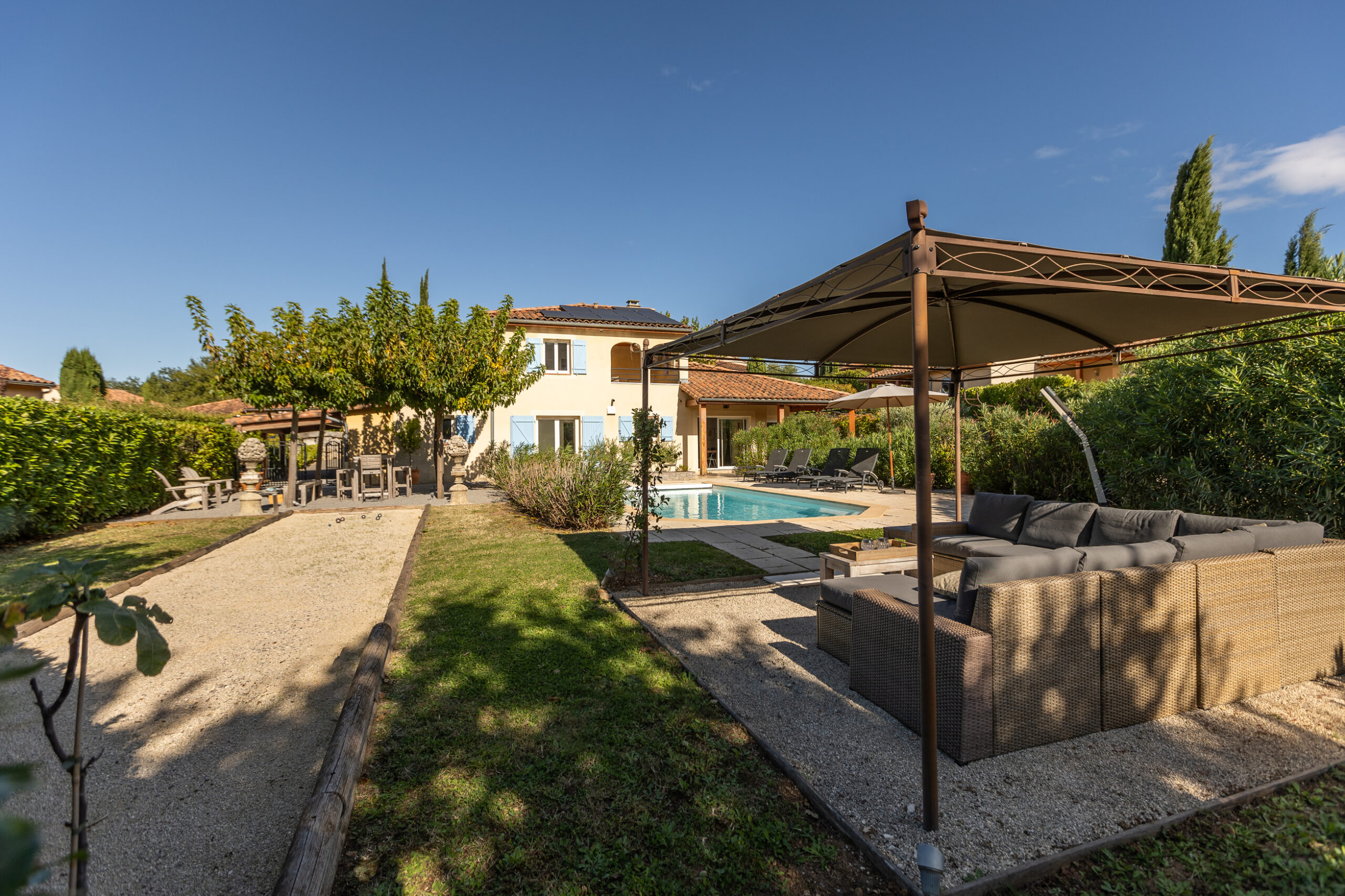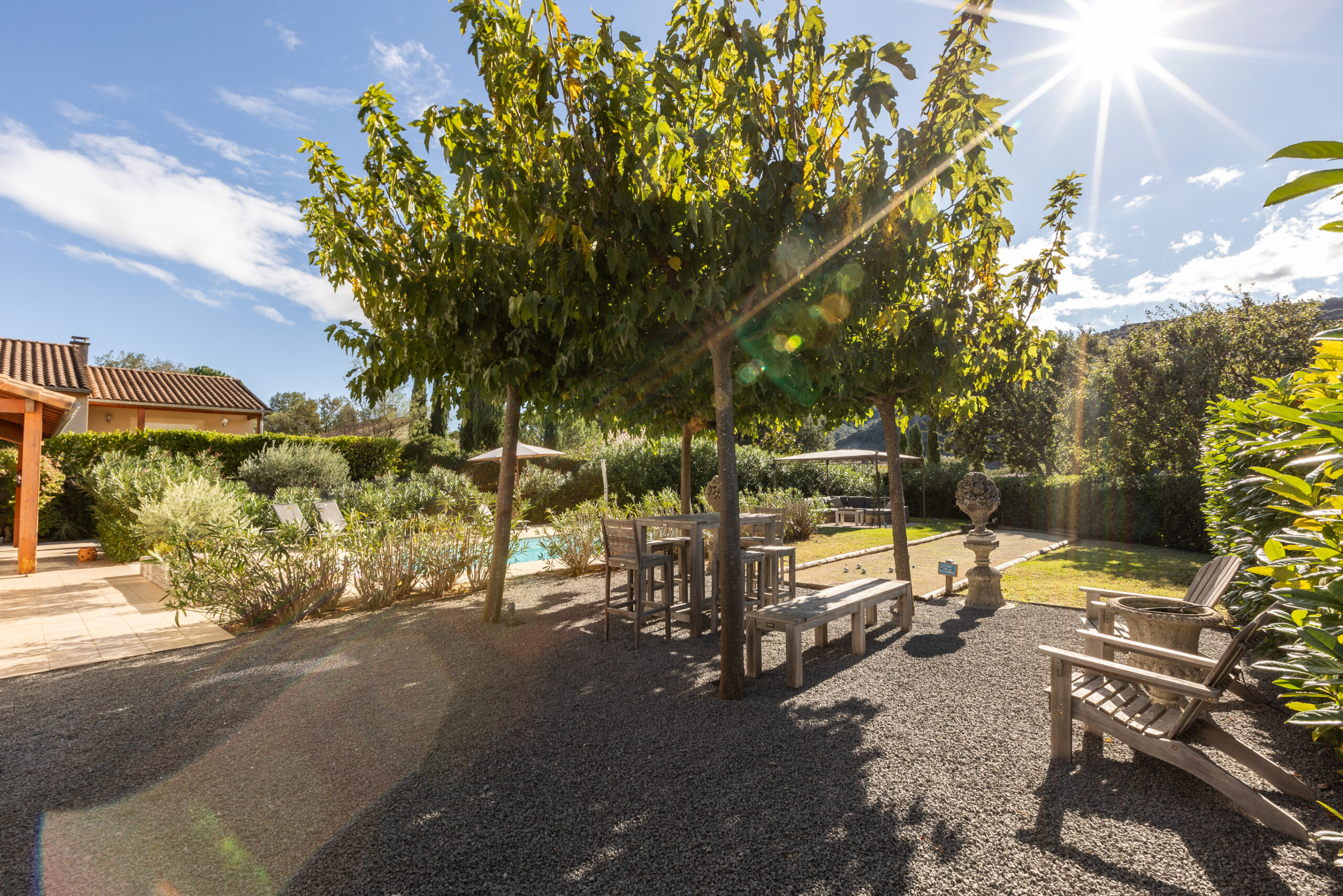 De zeer royale tuin van circa 830 m2 levert vanwege de hogere ligging een schitterend vrij uitzicht over het park en op de bergen. Het zicht op het zuidwesten zorgt voor een zonovergoten verblijf. Desgewenst kan op het overdekte terras, onder het overkapte prieel of onder de platanen van de eigen jeu de boules-baan als natuurlijke parasol de schaduw worden opgezocht.