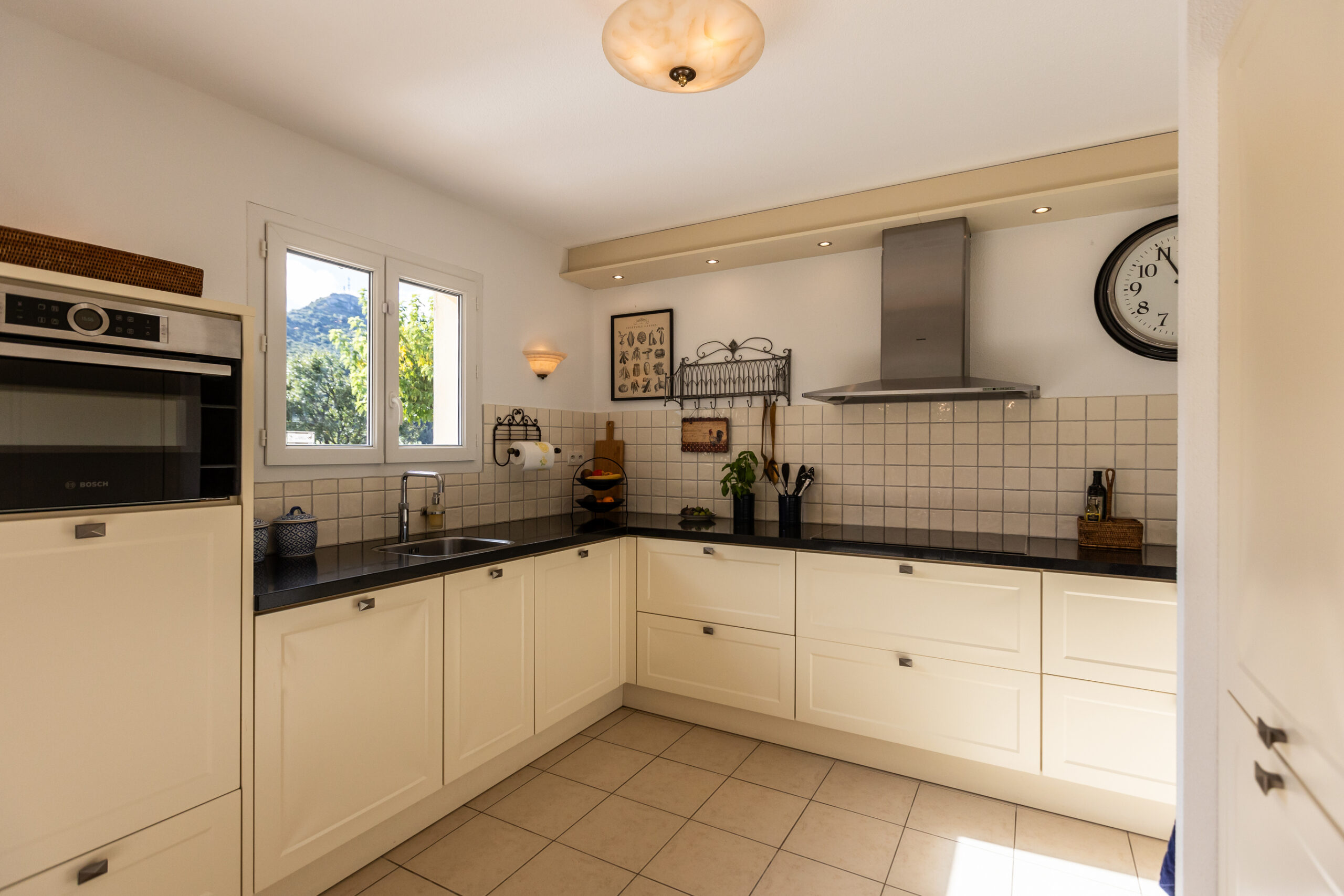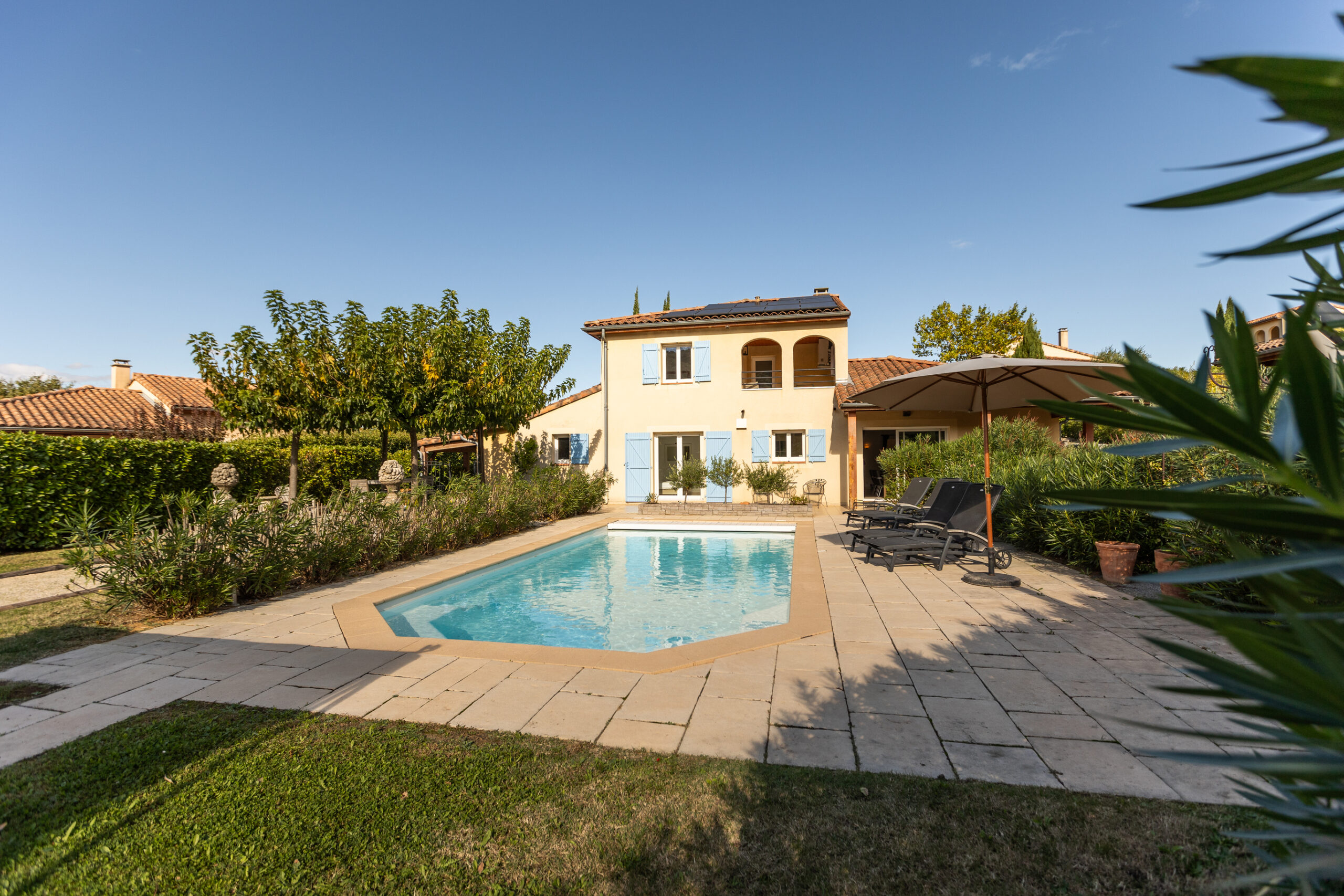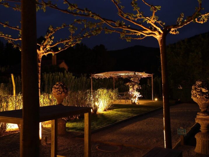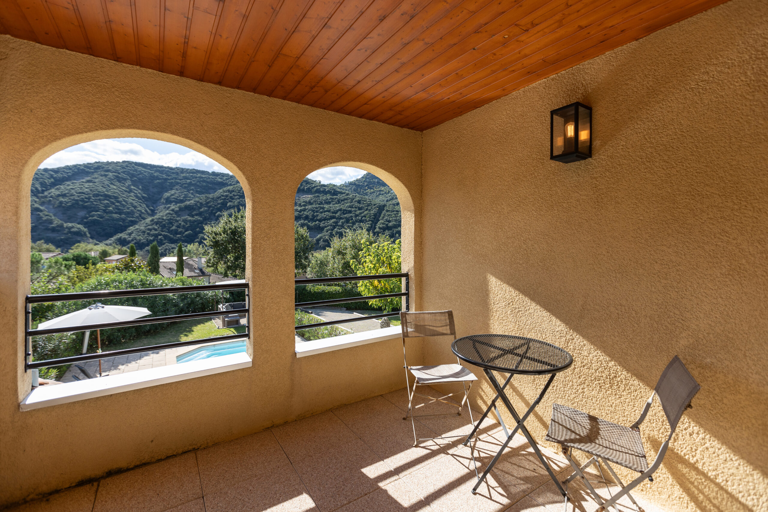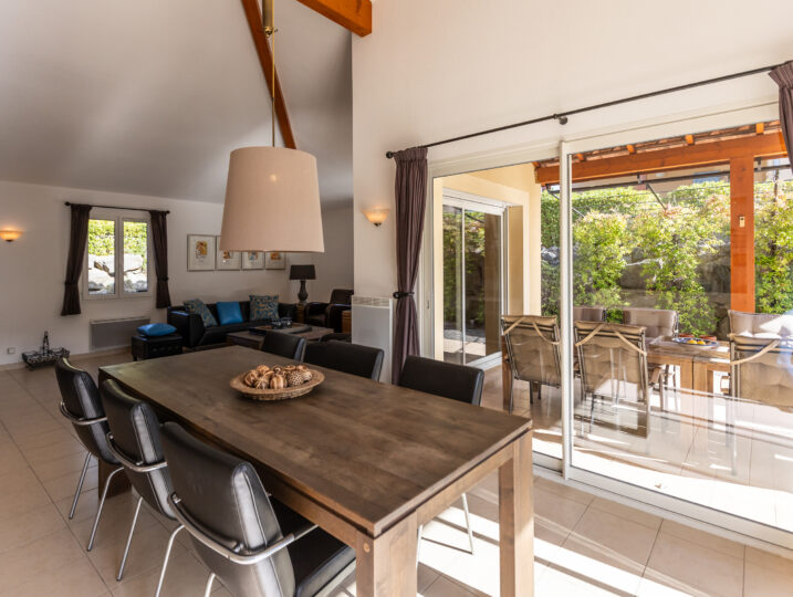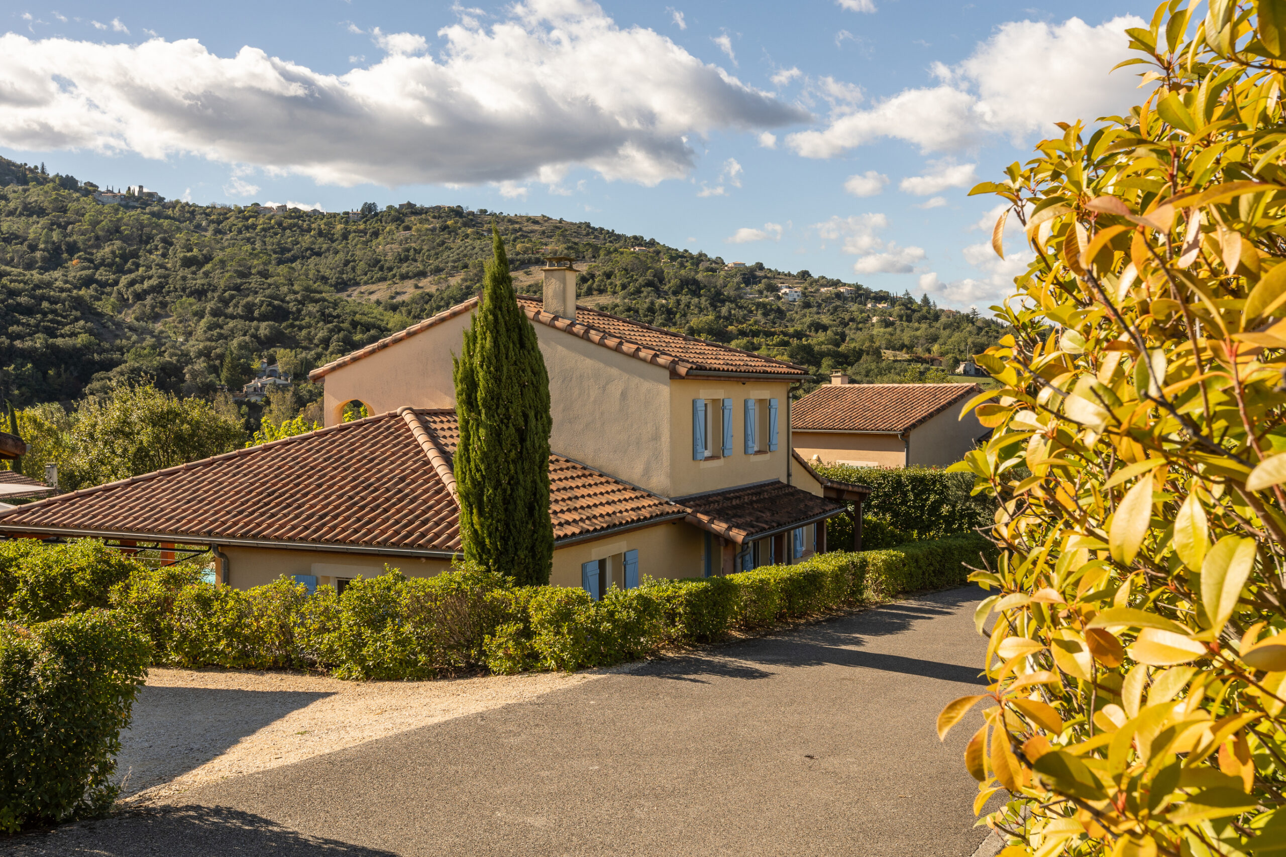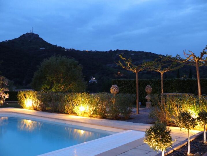 De zeer royale tuin van circa 830 m2 levert vanwege de hogere ligging een schitterend vrij uitzicht over het park en op de bergen. Het zicht op het zuidwesten zorgt voor een zonovergoten verblijf. Desgewenst kan op het overdekte terras, onder het overkapte prieel of onder de platanen van de eigen jeu de boules-baan als natuurlijke parasol de schaduw worden opgezocht.