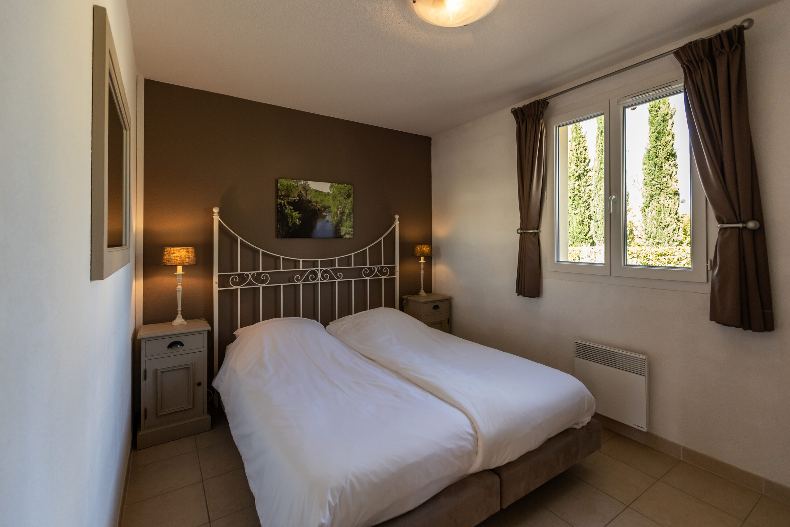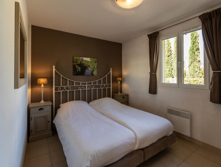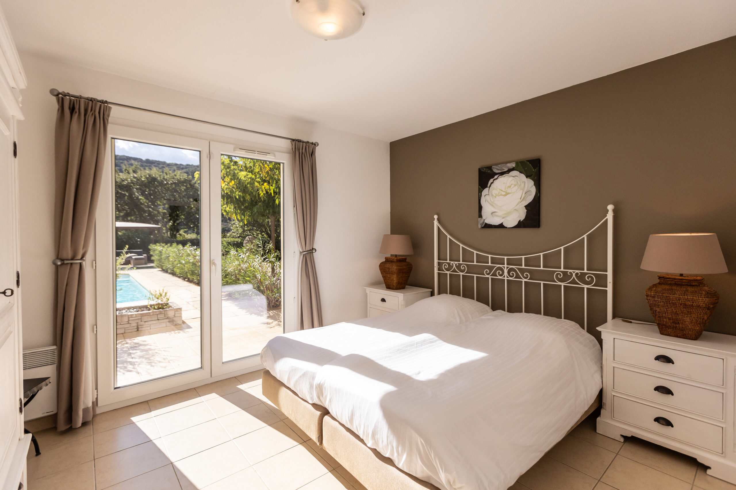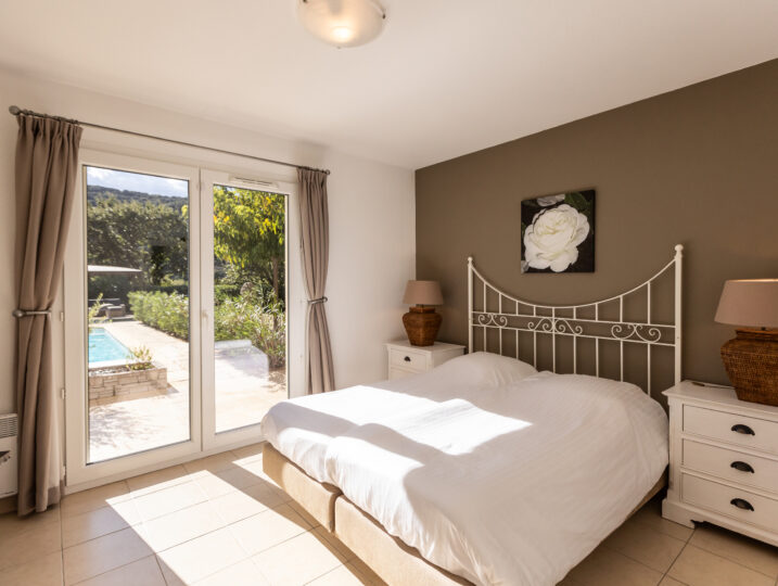 Begane grond: Hal, toilet, bergkast met wasmachine en droogrek en 2 ruime slaapkamers: de ene slaapkamer met twee box spring bedden van 80 x 200 cm en kledingkast heeft openslaande deuren en geeft direct toegang tot de tuin en het zwembad. De andere slaapkamer heeft eveneens twee box spring bedden van 80 x 200 cm en een kledingkast. Tussen de 2 slaapkamers bevindt zich een badkamer met douche, wastafel en toilet. Beide slaapkamers zijn voorzien van airconditioning.