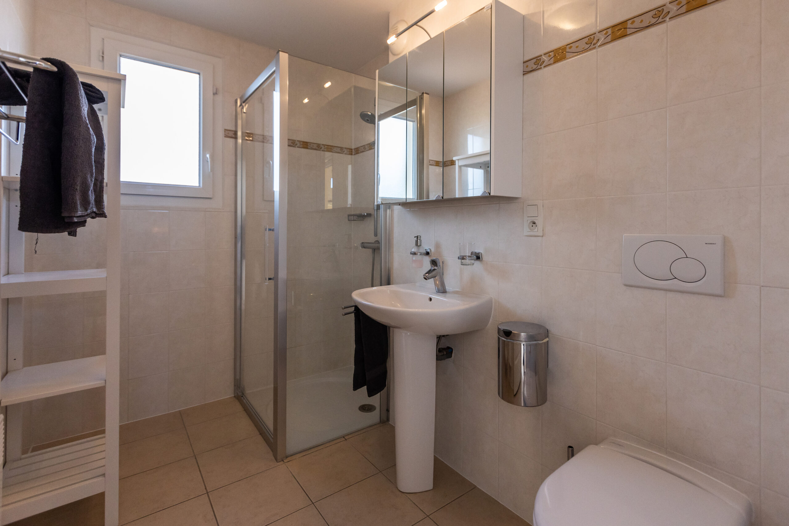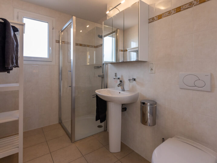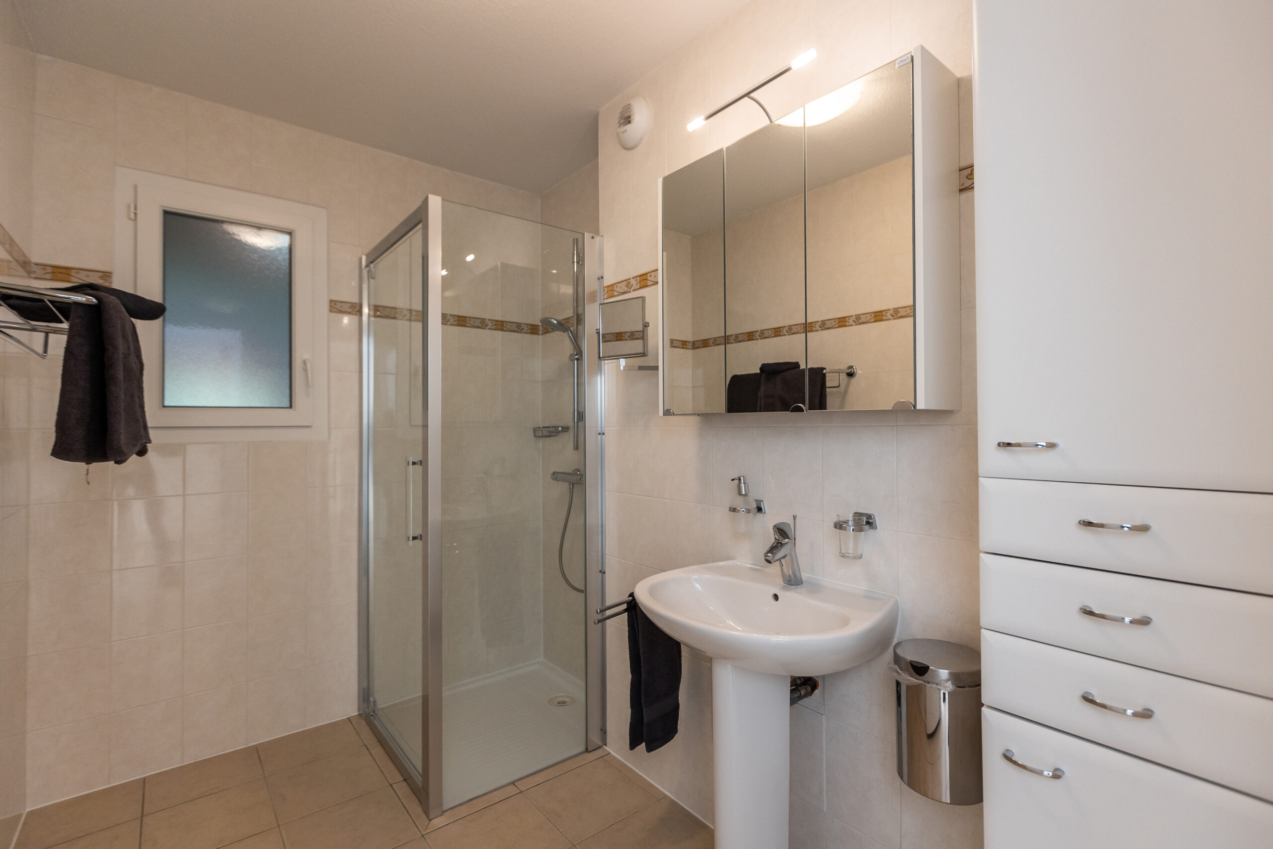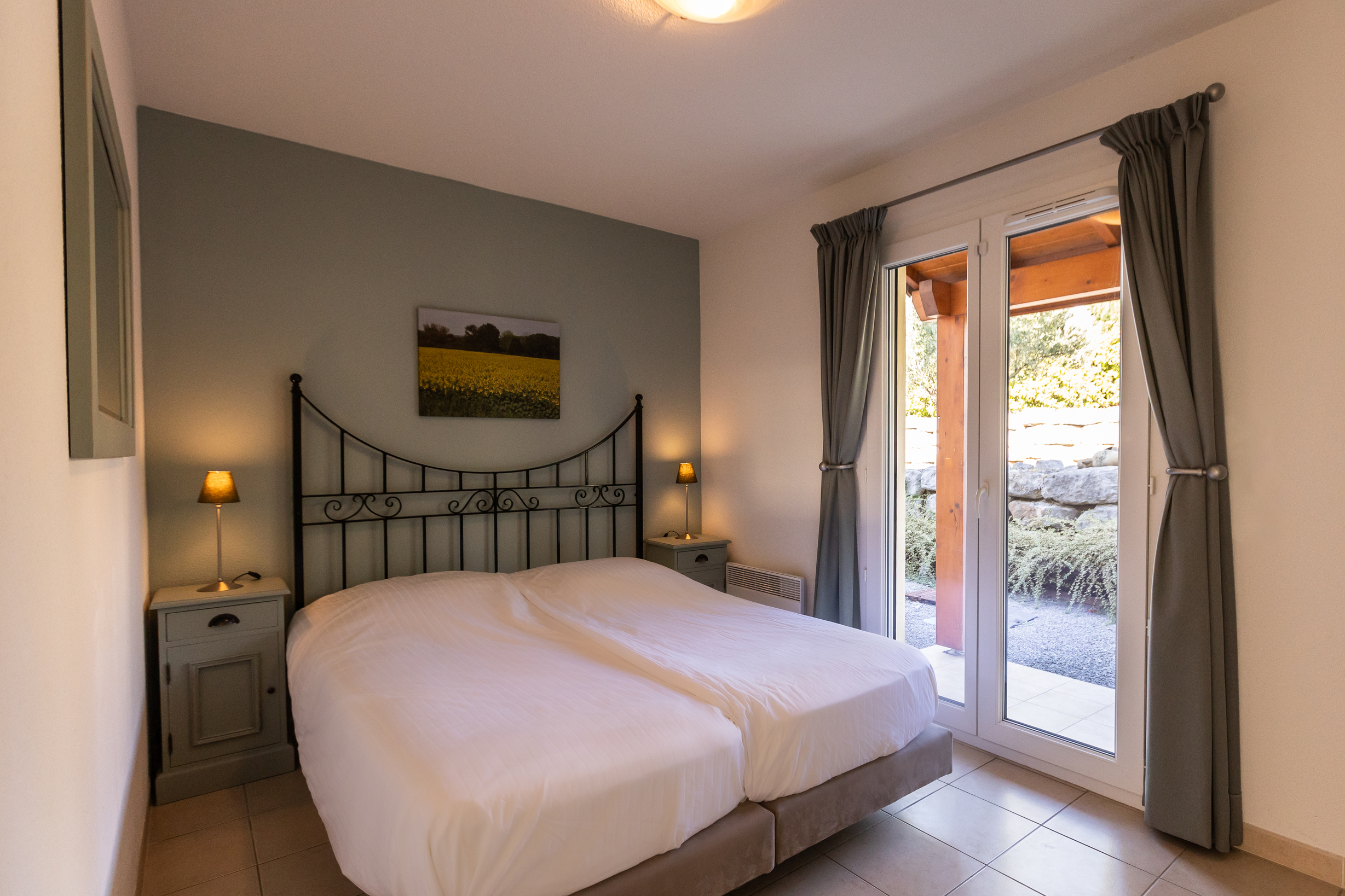 Begane grond: Hal, toilet, bergkast met wasmachine en droogrek en 2 ruime slaapkamers: de ene slaapkamer met twee box spring bedden van 80 x 200 cm en kledingkast heeft openslaande deuren en geeft direct toegang tot de tuin en het zwembad. De andere slaapkamer heeft eveneens twee box spring bedden van 80 x 200 cm en een kledingkast. Tussen de 2 slaapkamers bevindt zich een badkamer met douche, wastafel en toilet. Beide slaapkamers zijn voorzien van airconditioning.
