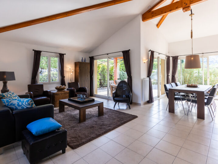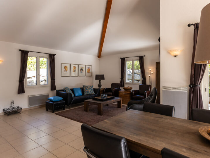 Grote woonkamer voorzien van airconditioning met 3 schuifpuien naar het terras, hoog plafond, royale televisie aan de muur, 2 a 3-persoons leren bank, 2 leren fauteuils en een dressoir. De woonkamer gaat over in de eetkamer met tafel en 8 stoelen die aansluit op de moderne open keuken. De comfortabele keuken is voorzien van alle apparatuur, zoals een Qooker-kraan, kookplaat, oven, magnetron, vaatwasser, koelkast met vriezer, goede kwaliteit servies- en glaswerk, pannen, ovenschalen, broodplanken, messensets en dergelijke.