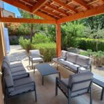 De vakantiewoning “Oleander” met verwarmd privé zwembad, airco op 4 slaapkamers én ….met vrij uitzicht op de oever en de rivier de Ardèche met voorbijtrekkende kano’s via groot vlonder terras waarop loungeset en eetset.